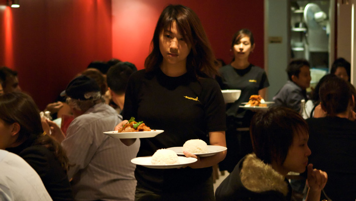 The restaurant is narrow, noisy and cramped. Large photographs of chefs at work with flaming woks or stretching roti (and other restaurant scenes), hang on a feature red wall on one side of the room. Attentive and young staff dressed in black t-shirts and wearing colourful Crocs effortlessly glide through their tight surrounds and amongst dark laminated tables filling fast with diners. There is a distinctive buzz about the place.