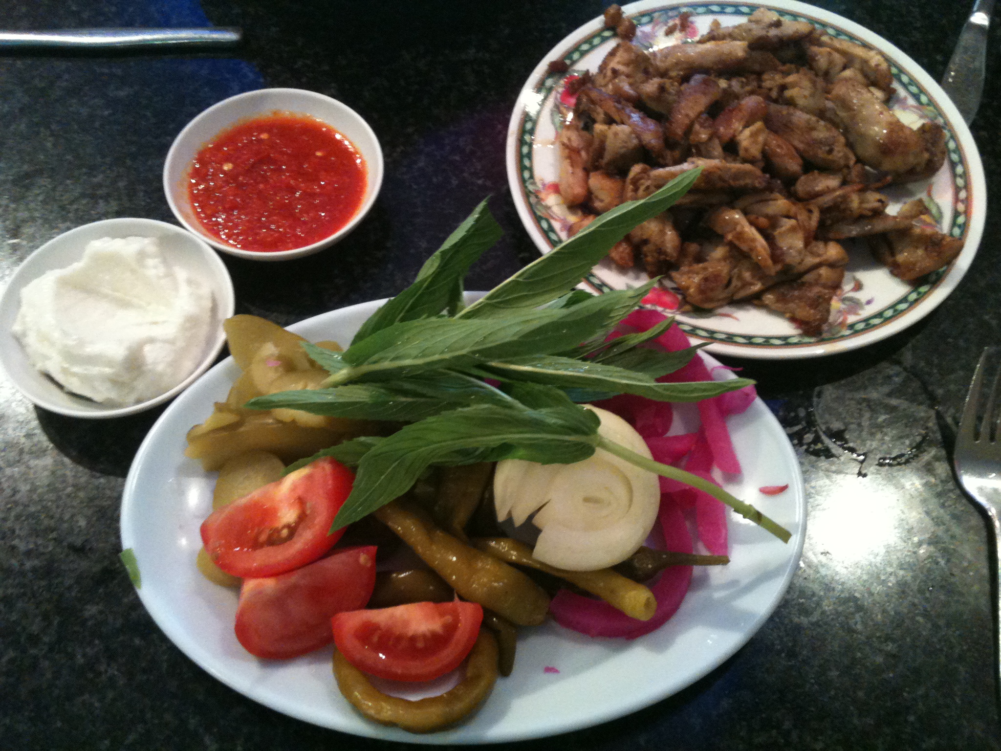 Once you order out comes a basket full of unleavened bread and a plate of mezes consisting of pickled cucumber slices and chili, olives, tomatoes, torshi lift (pink-coloured pickled turnip), onion, fresh mint and dished of harissa and one of the best toum I have tasted. Toum is that wonderful light emulsion of minced garlic and olive oil (it’s like aioli). At Jasmins it is creamy, fluffy and airy like a mousse. This one is not too overpowering or overbearing and is used sparingly to liven up char-grilled meats. Divine.