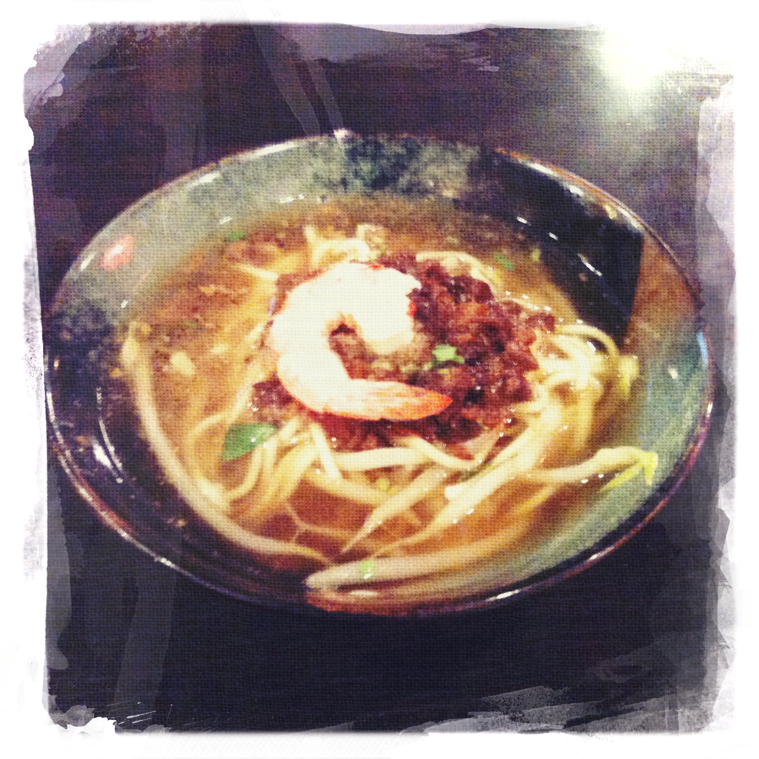 Tan tsai mian has two main ingredients – a special recipe of stewed pork and the soup’s broth. The minced pork comes from pigs’ hind legs and is stir-fried with Taiwanese shallots, rock sugar and other spices and sauces, and then simmered for several hours until it becomes dark-coloured. The broth is made of prawn heads, mashed garlic, coriander and black vinegar. Oil noodles (made of wheat), are placed in a small bowl with the broth and this is then topped with the minced pork and a prawn.