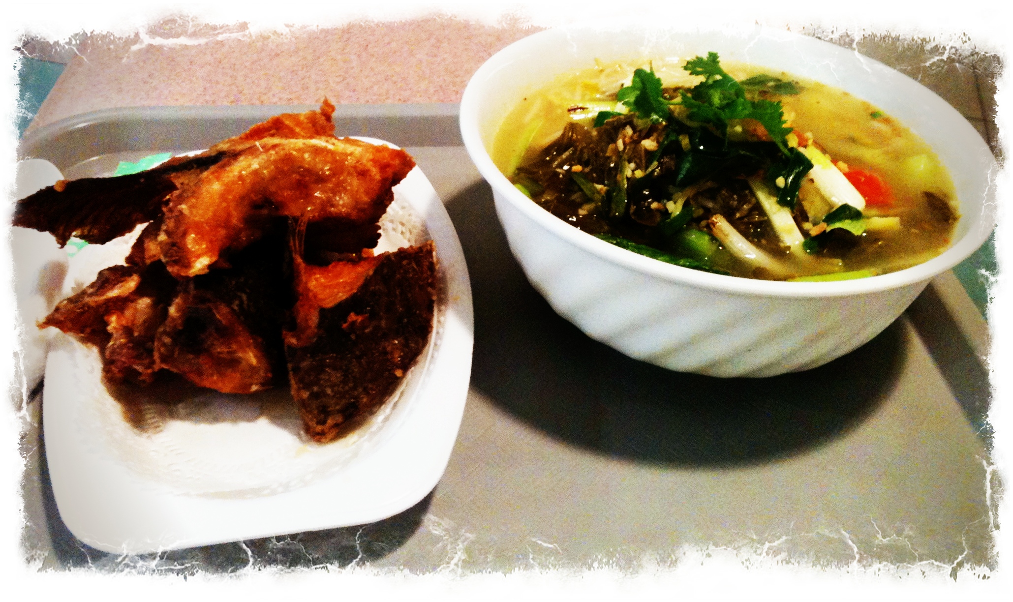On my last visit I just had to order the intriguing salmon fish head noodle soup. Out came a large bowl of soup and next to that the cut up and fried salmon head. The soup was a clear vegetable-based broth of minced garlic, pickled cabbage, tomato, greens, rice noodles, long pieces of spring onion, sliced ginger and bean sprouts. It was slightly sweet and sour (like a ripened tomato) but well-balanced – the much-needed acidity helping to tackle the fried salmon head. The salmon was chopped into huge pieces and simply seasoned with salt and pepper and then deep-fried. I added a dollop of sambal to the side (available on the counter along with other condiments). This is “pick it up with your fingers, smother it in sambal and rip it apart or dunk it into soup’ kind of dining. The soup revitalises the palate from all that lip-smacking and tasty crispy skin and pink and white oily flesh. Who needs fish oil capsules when you can get an Omega-3 rush in a single meal like this. Brain food at its best. It ain’t everyone’s cup of soup but worth trying and again another big meal but this one conquered me and a bit of soup was left in the bowl.