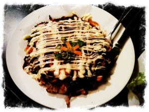 Update December 2012: Mr D and Mrs V have spent the past 12 months living the high life in London so on a recent visit by Mr D to Sydney he dined with me and the Baroness. The kakuni ($15) and salmon tataki ($17) were exceptional as always. Something none of had before was the seafod okonomiyaki ($11.50) – this one with a mixture of calamari fish and prawns and shredded vegetables with a wonderful, rich smokiness to it. A must try. Mr D went back too London happy to have been back to Samurai (and donning his new Samurai Cafe T-Shirt).