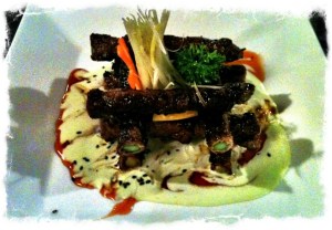 As tempted as I was to again have the salmon tataki I ordered the beef and asparagus ($17) as a main. This was a well-presented dish – long logs of thinly-grilled beef rolled around steamed asparagus spears which were arranged to form a layered box. This structure was surrounded by a wasabi mayonnaise. It was a nice creation using traditional Japanese methods and ingredients with the grilled beef combining well with the asparagus. An interesting – but not mind-blowing – dish but certainly a different option ideal for diners who wish to stray from the predominately classic Japanese-dominated menu.
