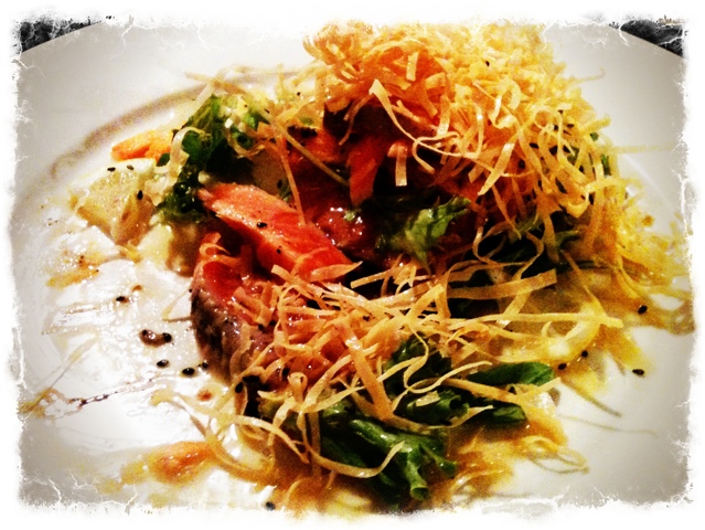 Mr D suggested as it was a warm and balmy night and the riesling was flowing liberally that we each get a serve of salmon tataki ($17). Mrs V squealed with delight. I now know why – the salmon tataki was simply sublime.