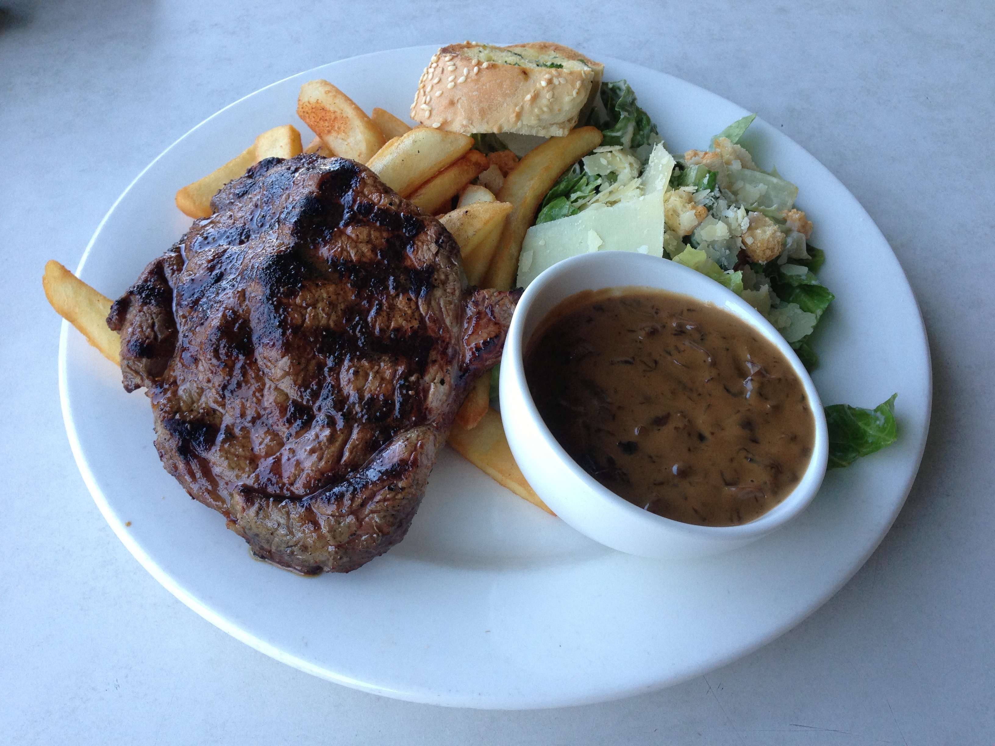 I ordered the $19.95 lunch special which was a 300g piece of rump with a choice between a Caesar salad or house salad as well as either chips or a potato. You also can have a sauce (mushroom, pepper, Dianne, chilli, Texas BBQ or herb butter), as well as a selection of mustard, and you also get a drink (a beer or glass of sparkling wine or red). The special was for a limited time – how limited, I’m not sure.