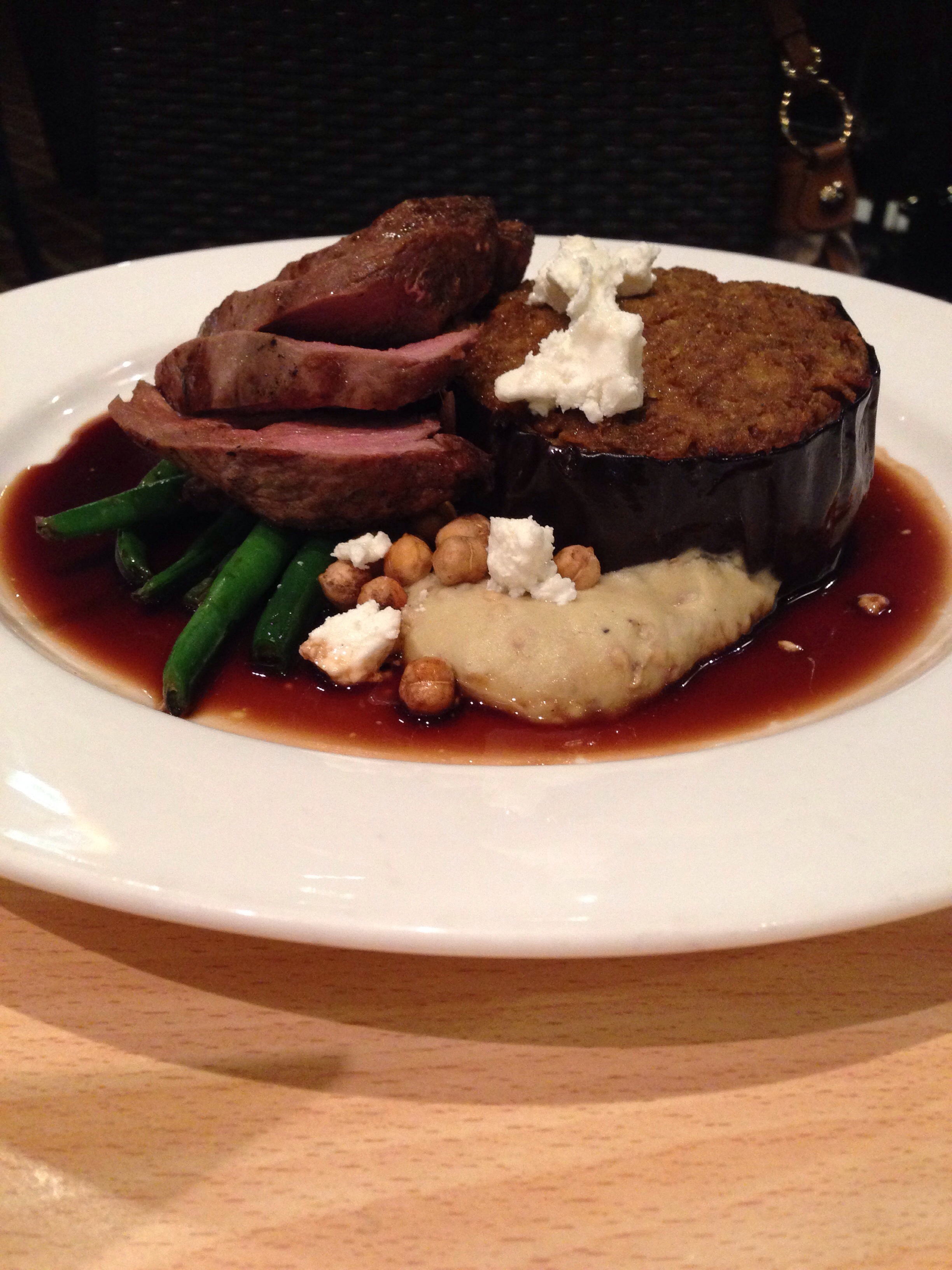 The Forwarder’s eyes popped out upon seeing the size of the purple eggplant that was a feature of her Mediterranean-inspired lamb dish. It swam in a lake of lamb jus and among pink slices of thick rump which sat on top of green beans. Small dollops of chickpea and fetta and spicy bubbaganoush (with a bit of tazaiki on the eggplant) made it a Mediterranean experience. The Forwarder couldn’t finish it. The lamb, she said was perfect, the eggplant though was too large and another vegetable substitute may have been a better alternative as there was already bubbaganoush on the plate (which is made from eggplant), and it was a bit of a case of aubergine overkill.