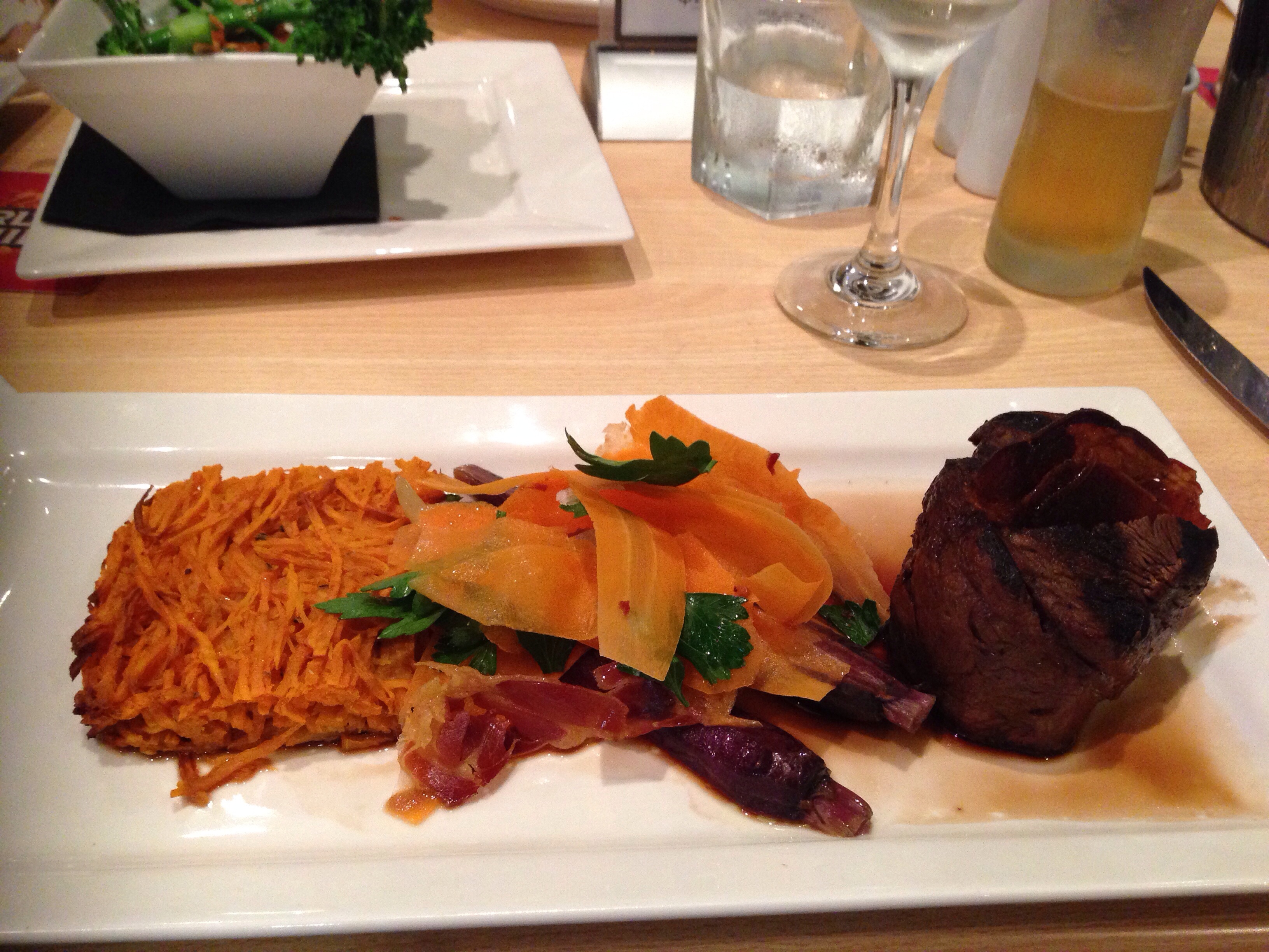 We skipped entrees and just went for main courses: Baroness and The Matriarch ordered Lomandra’s signature twice-cooked pork belly served with a sweet potato puree, seared Hervey Bay scallops, bok choy, sea salt dried crackle and an apple & cherry glaze ($32); The Broker and I ordered the coal-roasted beef tenderloin served with smoked potato rosti, roasted baby carrots , prosciutto, petite carrot salad & red wine jus ($35); and The Forwarder decided to go it alone and have the marinated lamb rump served with Mediterranean-filled eggplant, bubbaganoush, seasonal green beans, roasted chickpeas and lamb jus ($32). We also got a side of beer battered fries with aioli ($6) and some steamed broccolini with roasted almonds ($7).