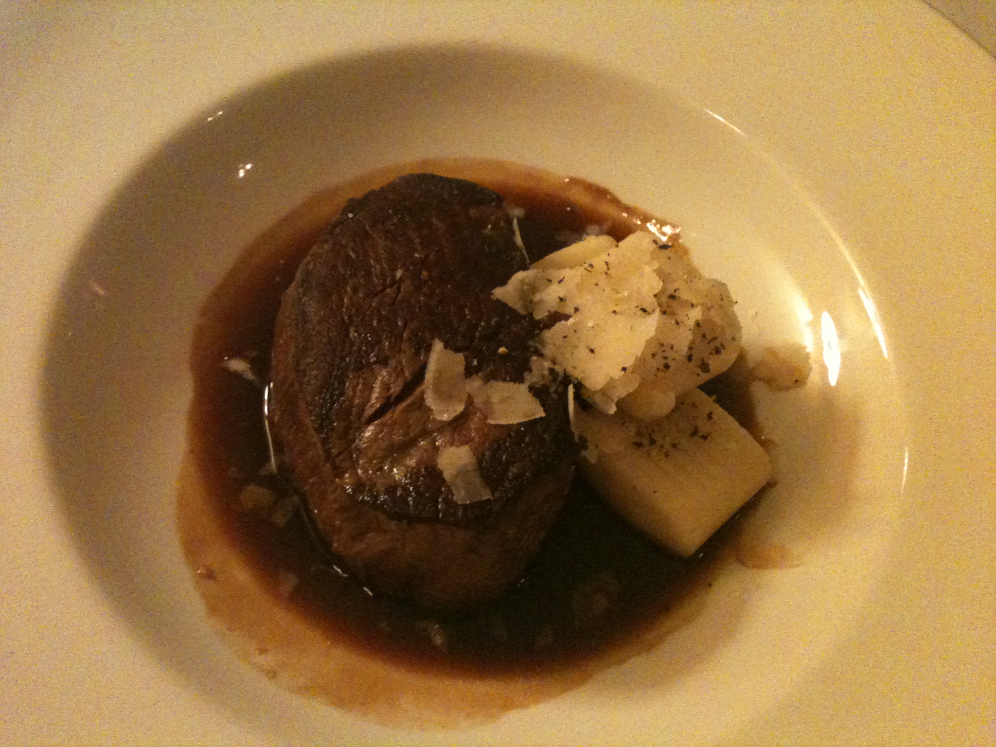 The beef was a large thick round of tender fillet, cooked medium to rare surrounded by a rich and well-seasoned oxtail reduction. Large, square gnocchi flavored with Parmigiano cheese and shavings on top made this a rich, hearty and sophisticated winter meal. Extra bread was offered to soak up the juices and was not refused. I recommended the dish.